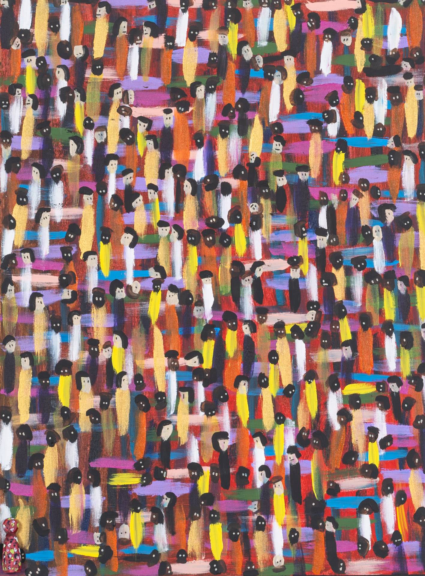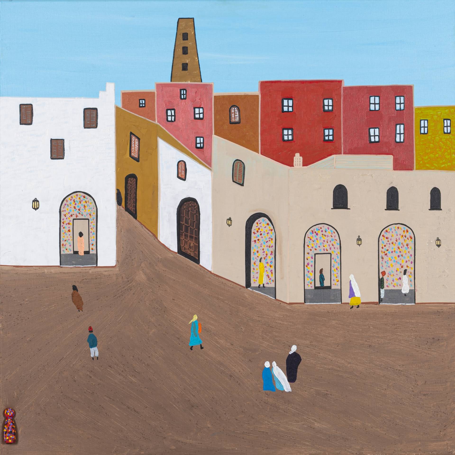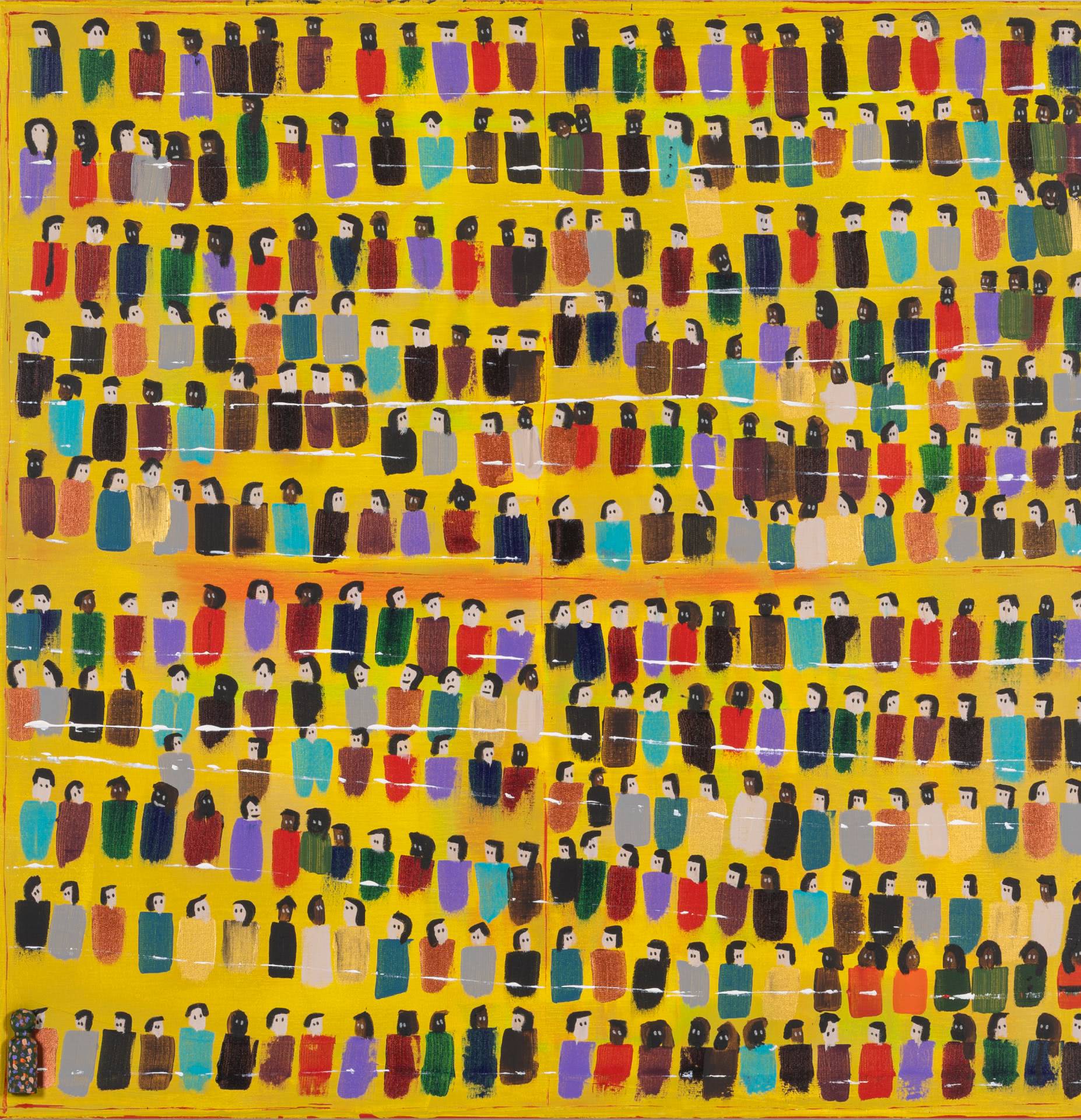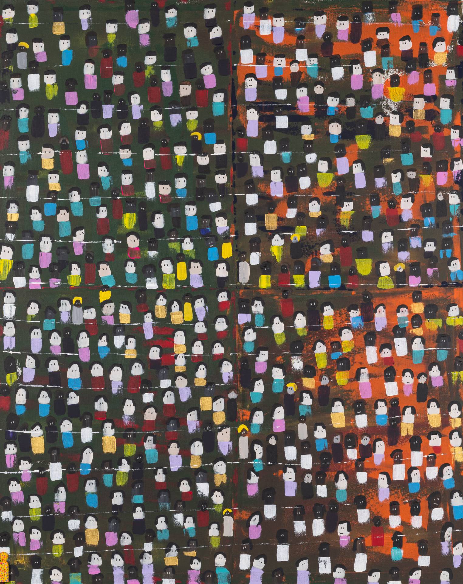 Using bold colours and filling his works in a manner of horror-vacui, Zarour’s paintings bustle with energy. By incorporating freehand techniques in his abstract pieces and in his more figurative works, he infuses his pieces with dynamic variations, breathing life into the structured movements he initially outlines. Through emphasizing intertwining and diverging lines and multitudes of figures on his canvas, the artist endeavours to symbolically underscore both the displacement and interconnectedness that take place between people.
