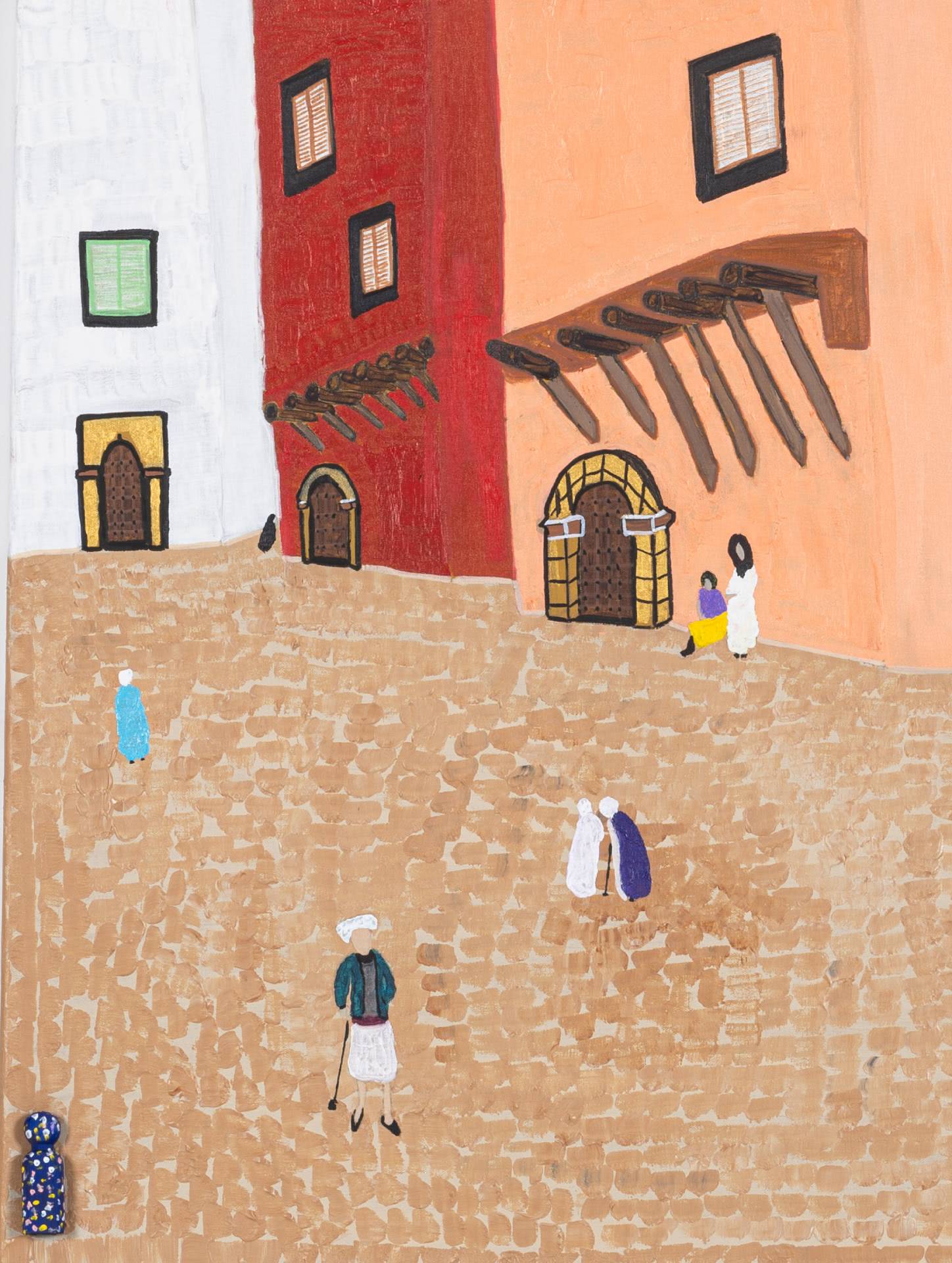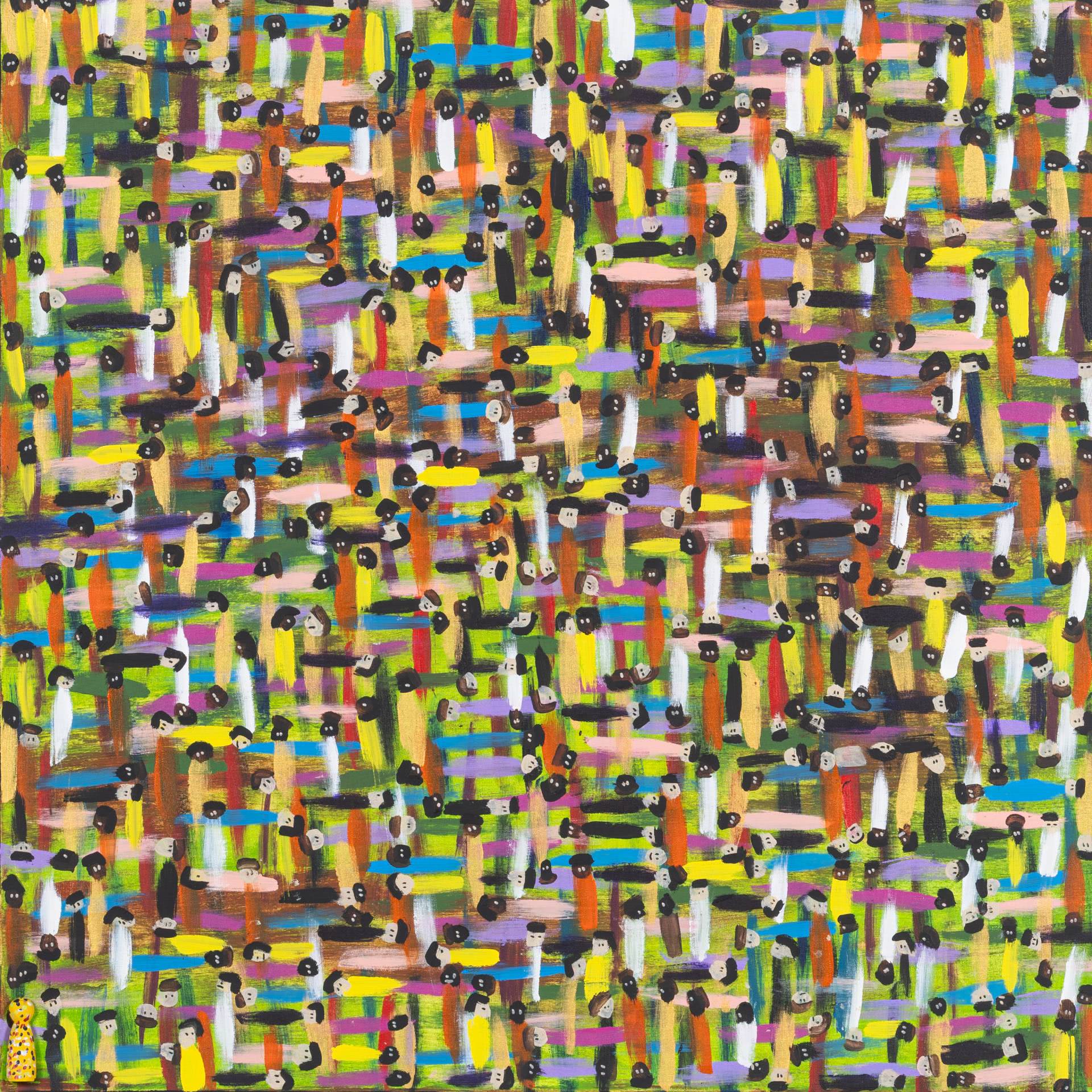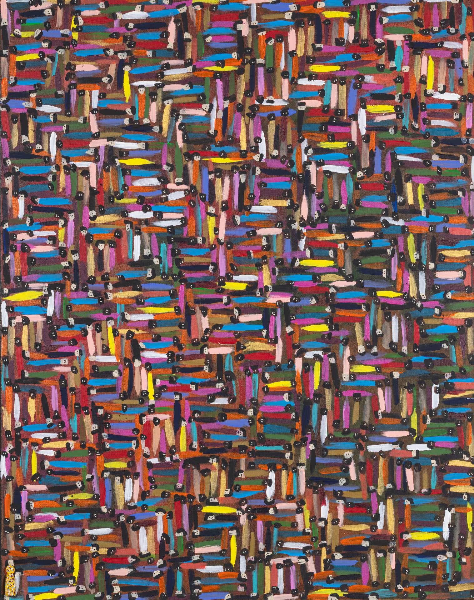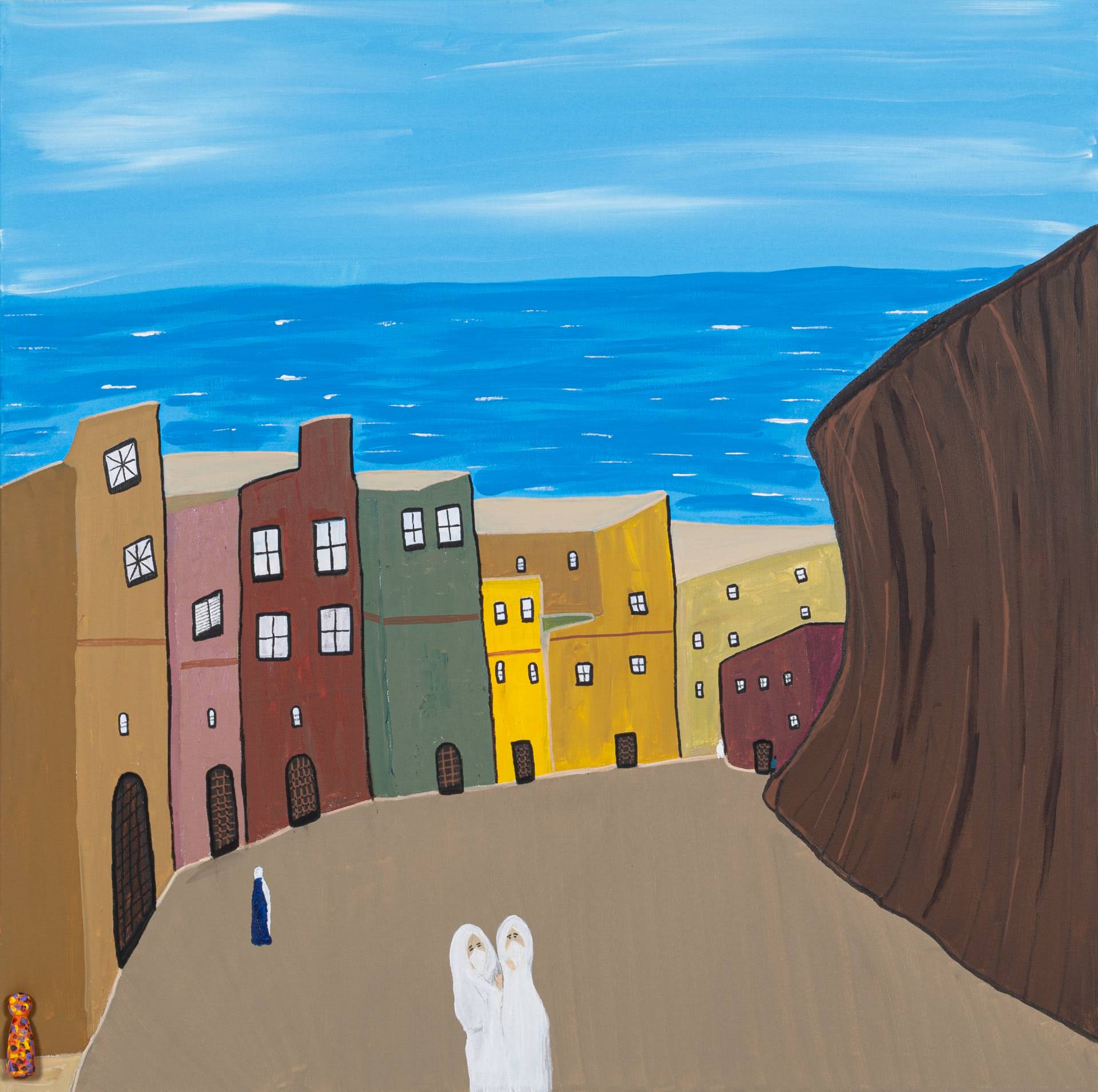 Using bold colours and filling his works in a manner of horror-vacui, Zarour’s paintings bustle with energy. By incorporating freehand techniques in his abstract pieces and in his more figurative works, he infuses his pieces with dynamic variations, breathing life into the structured movements he initially outlines. Through emphasizing intertwining and diverging lines and multitudes of figures on his canvas, the artist endeavours to symbolically underscore both the displacement and interconnectedness that take place between people.